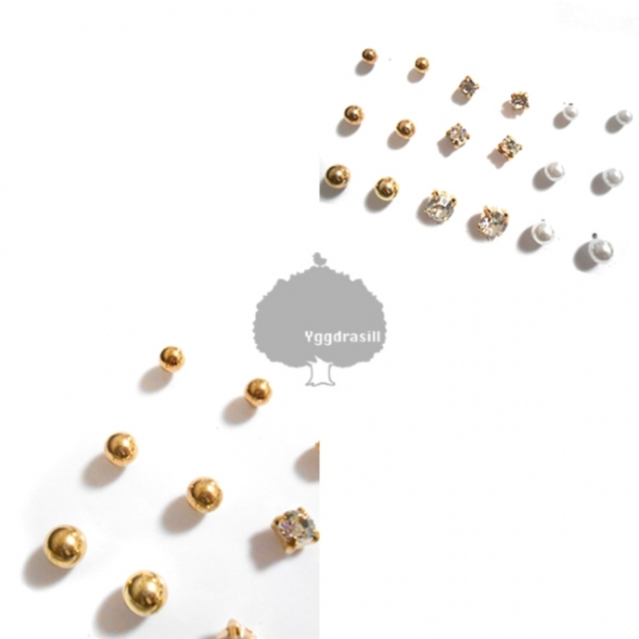 商品名:YGG★新品 ストレートピアス 18個セット ゴールド パール ラインストーン ラウンド スタッズ 金 1セット