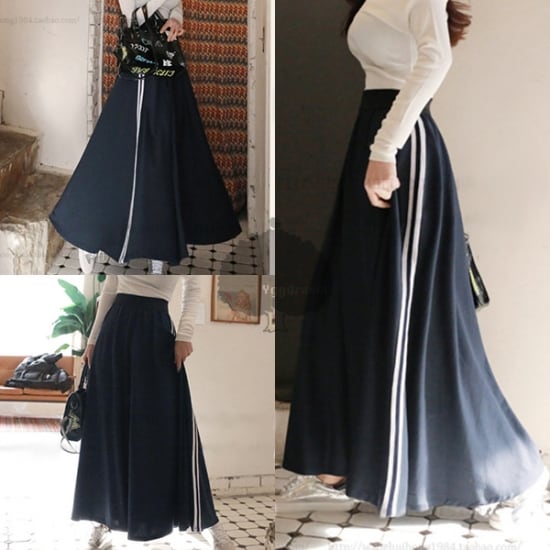 商品名:YGG★フレア マキシロングスカート サイドライン ネイビー 紺 ボトム スポーティ